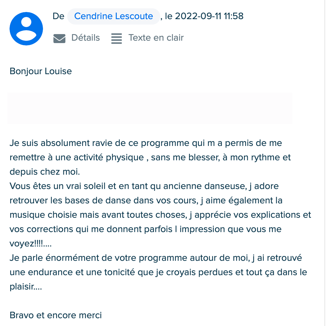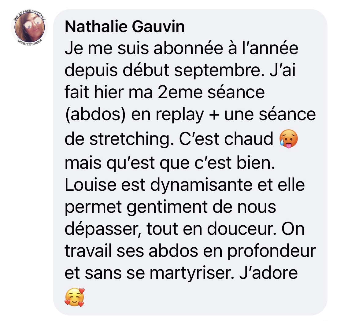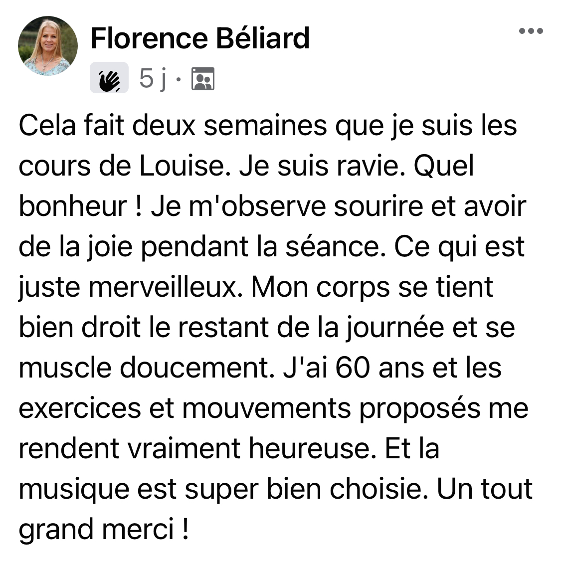 Grâce à Louise je sens que mon corps se dynamise et se renforce au fur et à mesure des séances.
